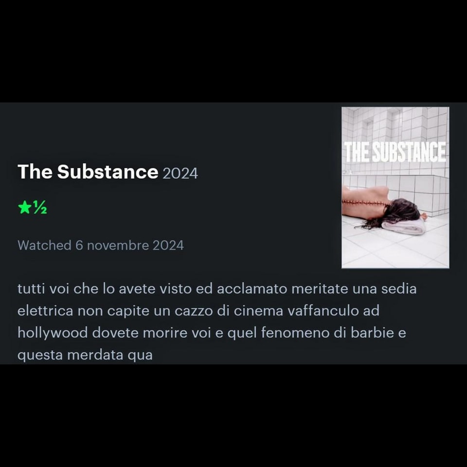 Il fatto dell’alterità implica la separazione delle coscienze; tuttavia, la condizione originaria della penuria trasforma la separazione in antagonismo. La materia diventa allora il mezzo con cui si cerca di prevalere in questo conflitto competitivo, ma spesso essa restituisce il contrario di ciò che si era posta la singola praxis. È questo il momento dello scacco: volevo realizzare questo fine e invece ho realizzato qualcos’altro (la sostanza). È qui che qualsiasi individuo sperimenta la dialettica della necessità, che si presenta nell’esperienza quando la materia lavorata ci sottrae la nostra azione, non in quanto materialità pura, ma in quanto praxis materializzata. La necessità non si contrappone alla libertà come suo contrario, bensì è il verme nel nocciolo dell’essere. È questa immagine radicale di inospitalità per la donna, sia da parte del mondo sia della donna stessa, che The Substance rende puntualmente.