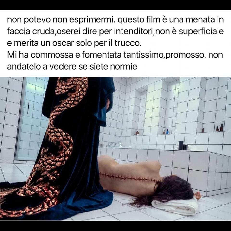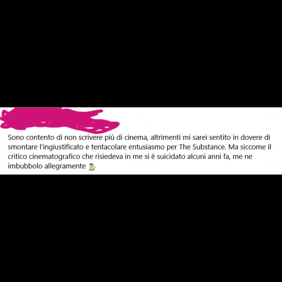 È impossibile, alla fine, capire che un uomo, parente o meno, dopo tutto non è altro che marciume in sospeso. È impossibile, inoltre, che un film mainstream si accontenti di raffigurare equivocamente e lievemente queste premesse, senza cedere voluttuosamente alla facile critica visual-gore della borghesia: sembra sempre si debba dispiegare, suggerire tutto, e, terminando, esprimere dettagliatamente gli scopi e le apparenti prede delle pellicole significanti. Salò è uscito tipo cinquant’anni fa.